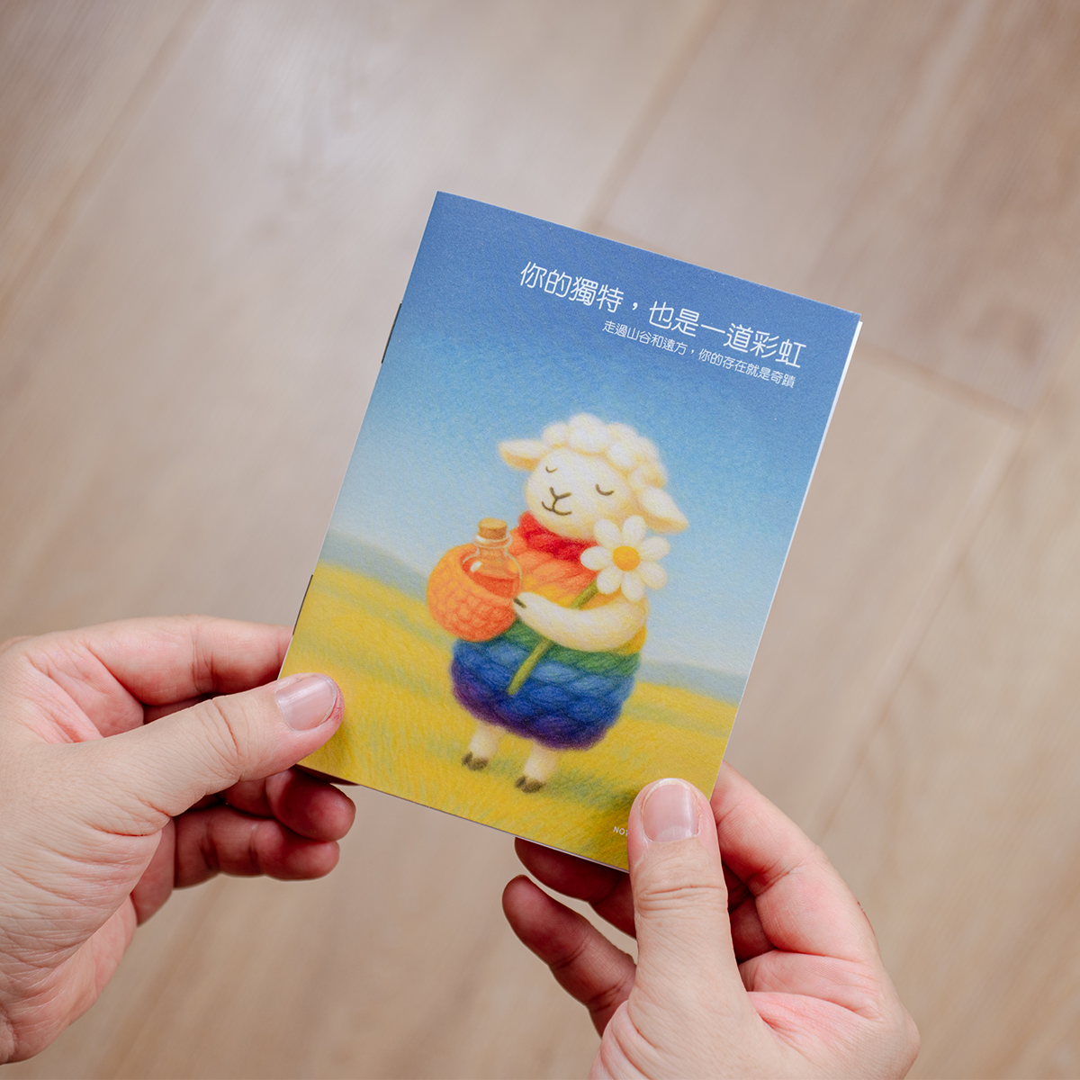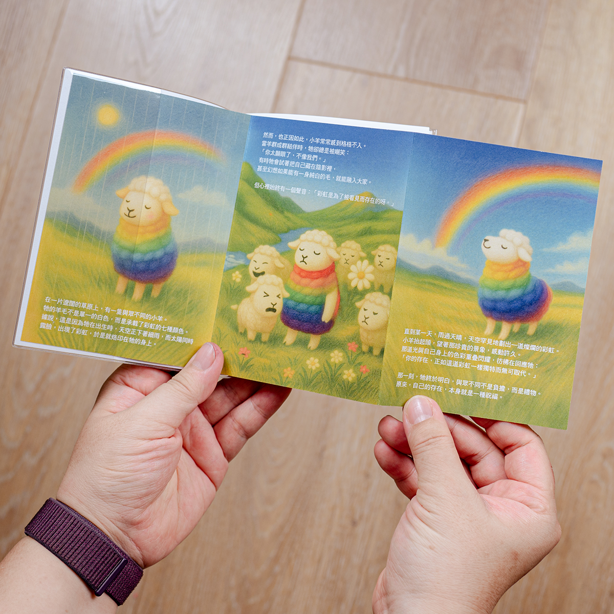 • 前頁為彩虹小羊的小故事繪本,帶你看見做自己並勇敢前行的力量。
