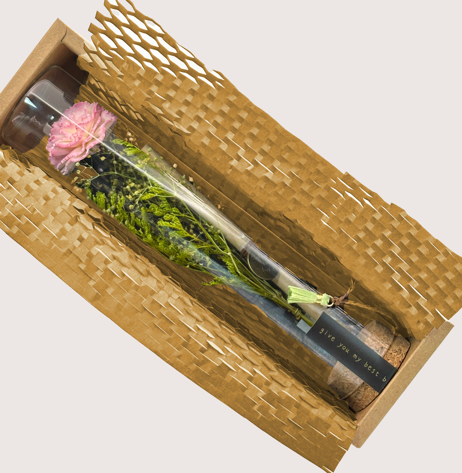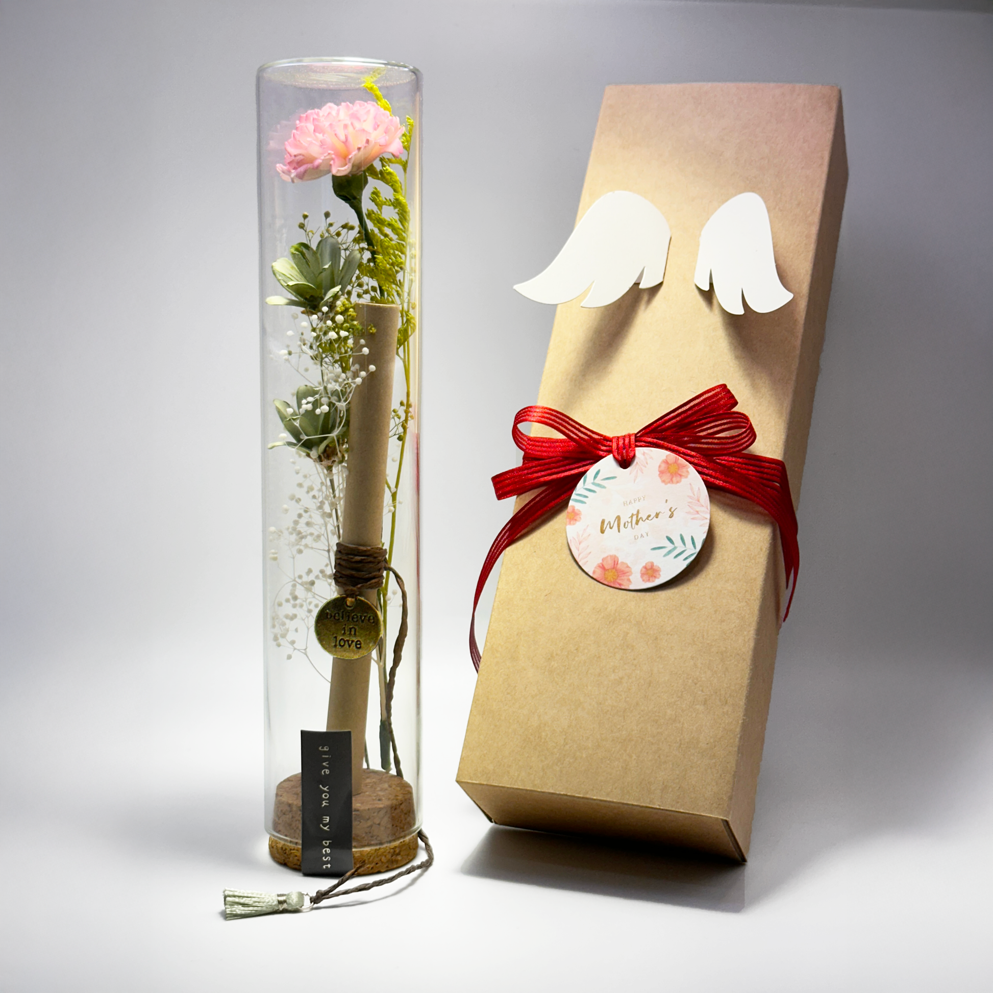 一朵永遠綻放的康乃馨+一封你寫給母親藏進玻璃瓶的話語。